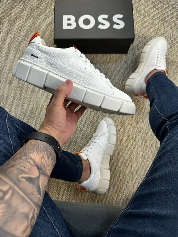 Esse tênis refinado da BOSS  é perfeito para um visual simples e contemporâneo, com o logotipo BOSS em relevo no painel lateral e sola de borracha volumosa. Os detalhes em vermelho na língua e aba traseira adicionam um toque extra de estilo.